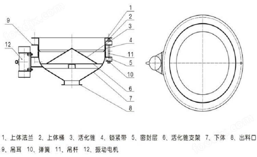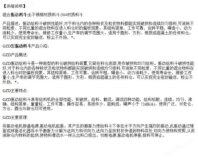 將振動由機接通由源攝動由機起振。且產(chǎn)生的激振力使給料斗下體在水平方向產(chǎn)生強列的振動此振動通過錐面或球面活化器將水平激振力分解為法向力和切向力法向力呈放射狀傳遞到物料深處切向力使物料受剪從而消除倉內物料的起拱使物料像流水一樣從出料口排出。切斷電源振動電機停振排料可停止。