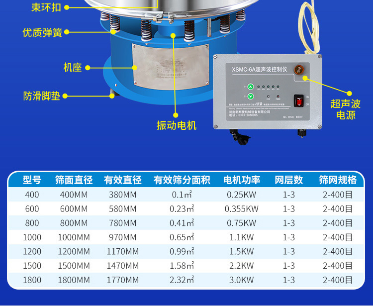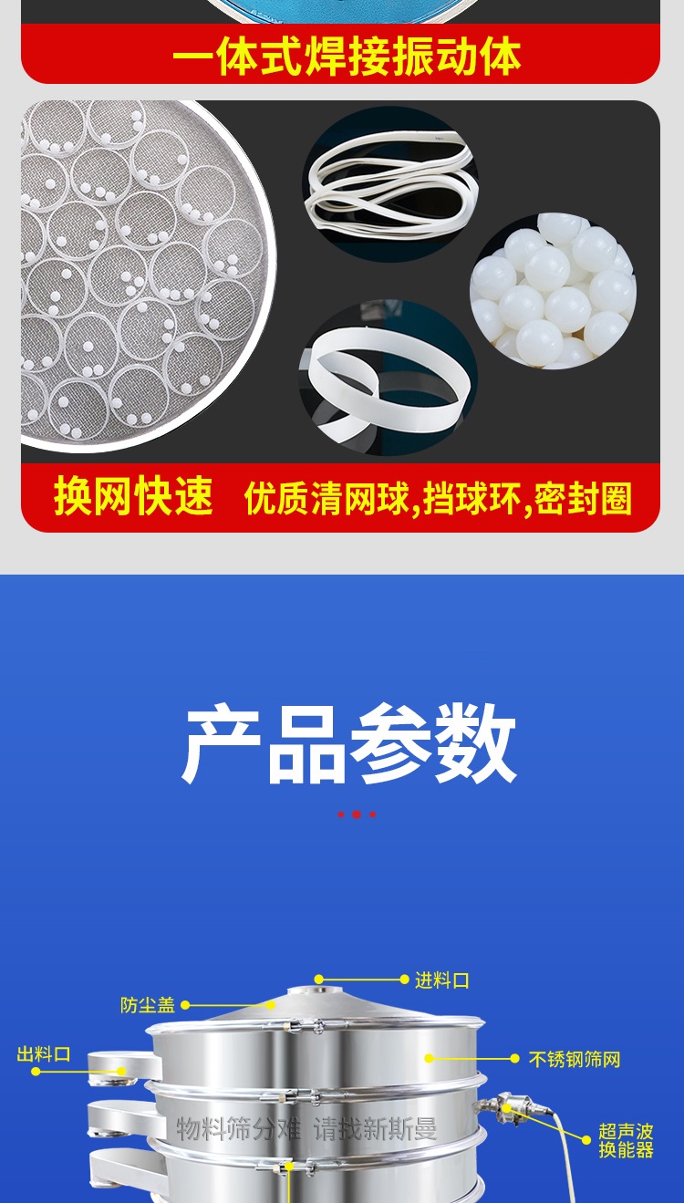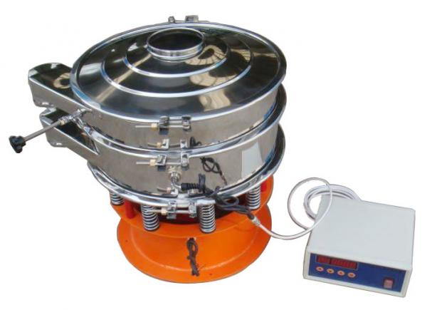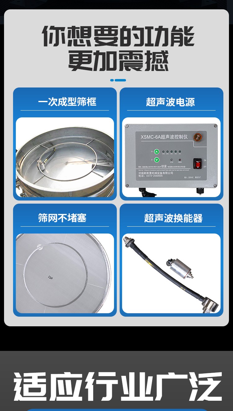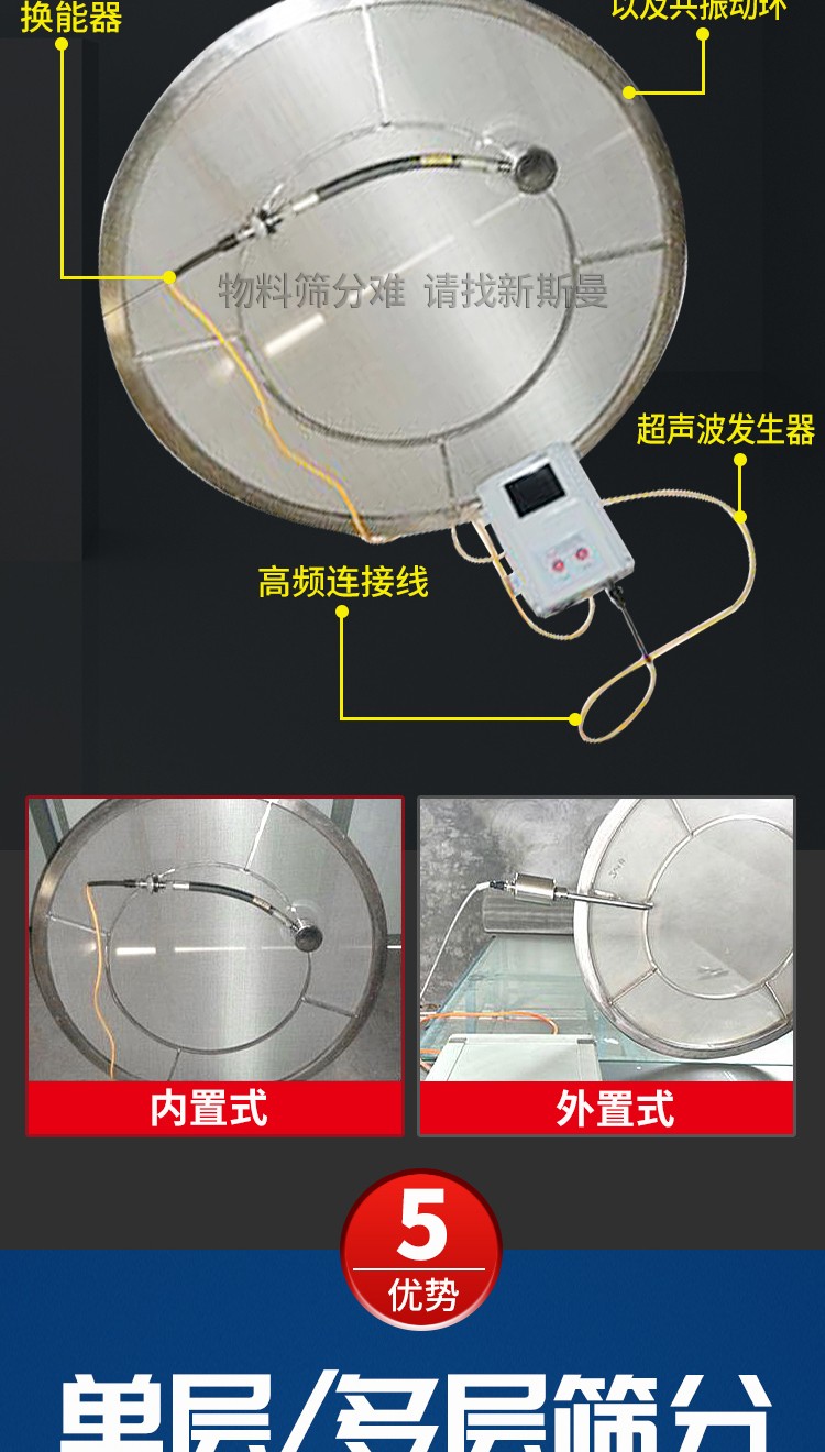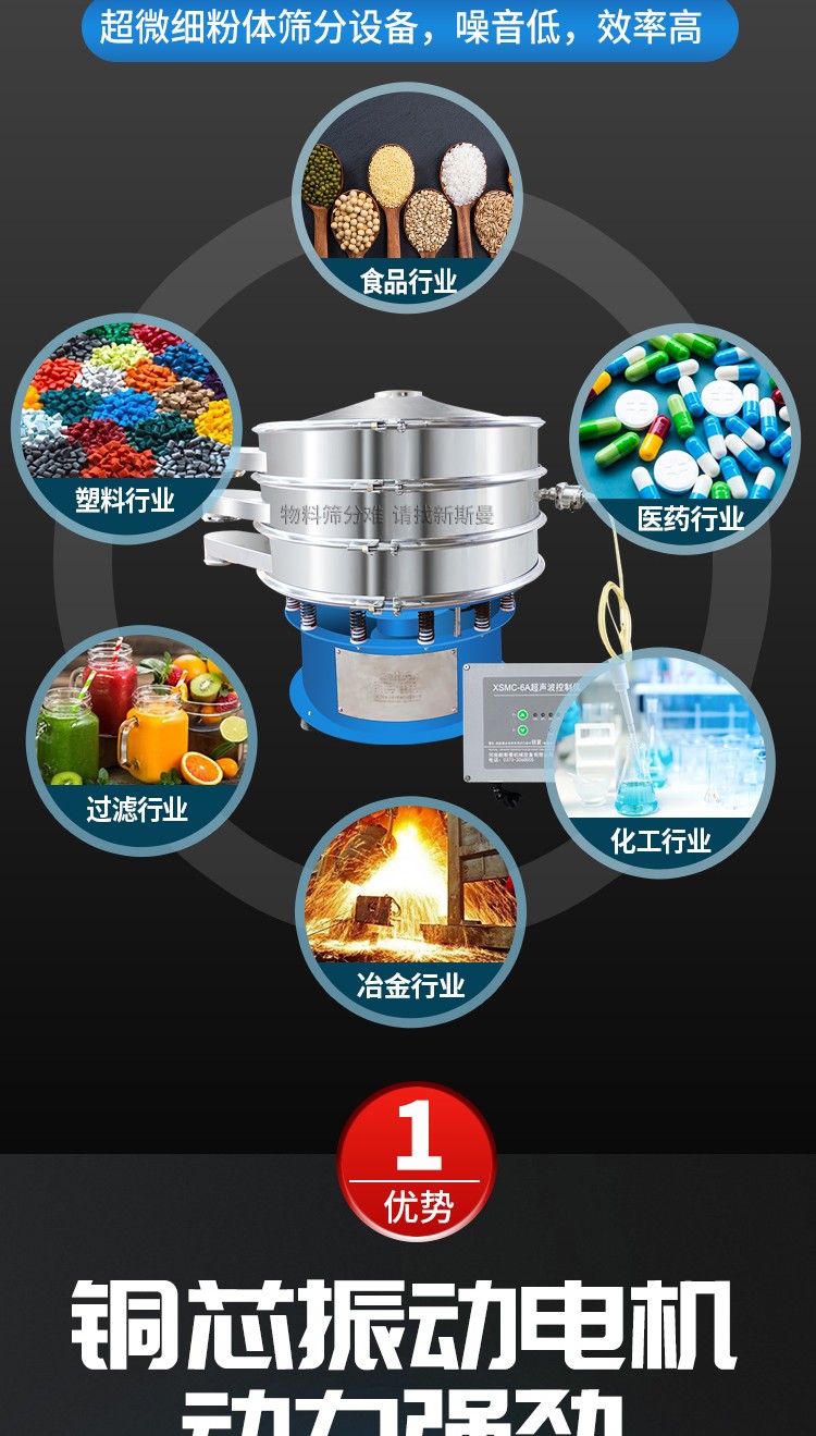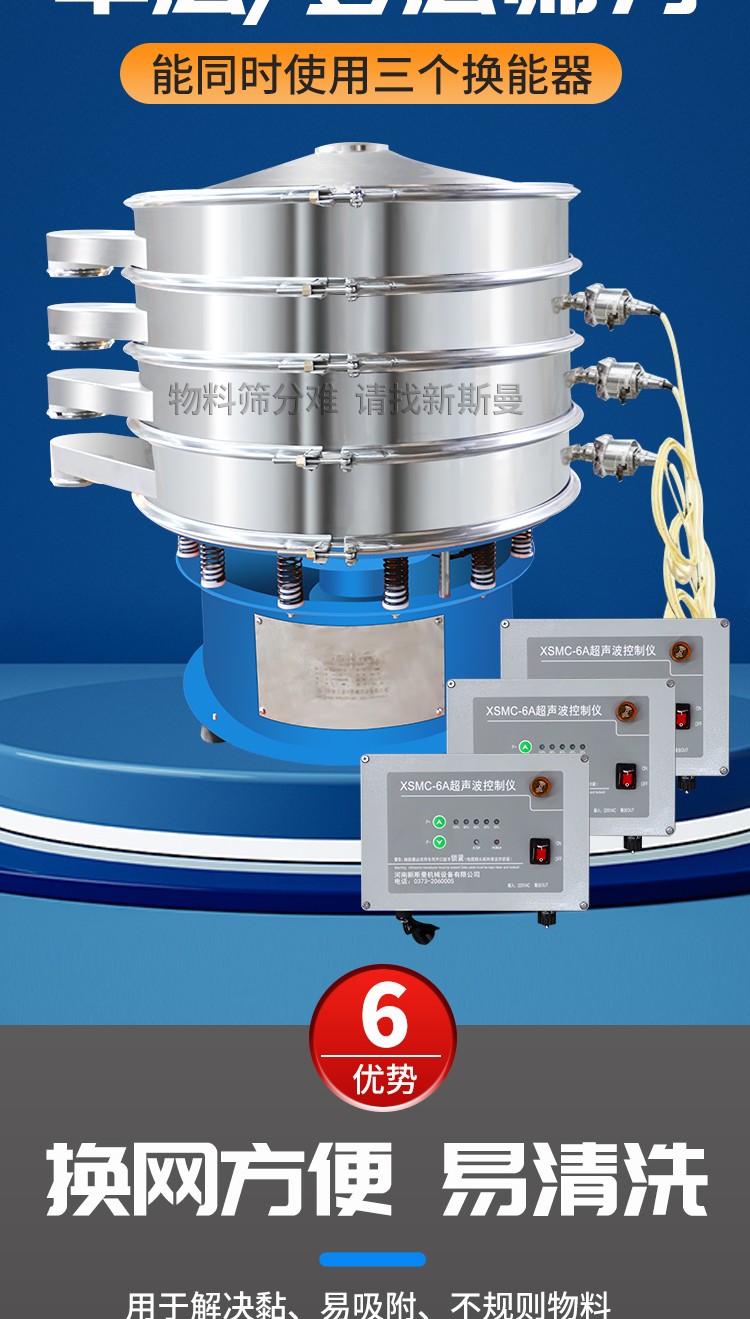 超聲波振動篩是將220V、50Hz或110V、60Hz電能轉(zhuǎn)化為36KHz的高頻電能,輸入超聲換能器,將其變成36KHz機械振動,產(chǎn)生的功率超聲波使篩網(wǎng)作高頻振動。篩網(wǎng)上的物料在作低頻旋振運動的同時,疊加上超聲振動,既可防止網(wǎng)孔堵塞,又可使篩分機提高產(chǎn)量和質(zhì)量,從而達到快速篩分和清網(wǎng)的目的,使超微細粉篩分成為易事。該系統(tǒng)在傳統(tǒng)的振動篩基礎(chǔ)上在篩網(wǎng)上引入一個低振幅、高頻率的超聲振動波(機械波),以改變超微細分體的篩分性能。特別適合高附加值精細分體的用戶使用。