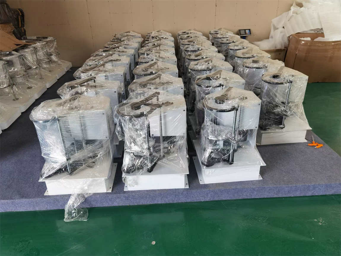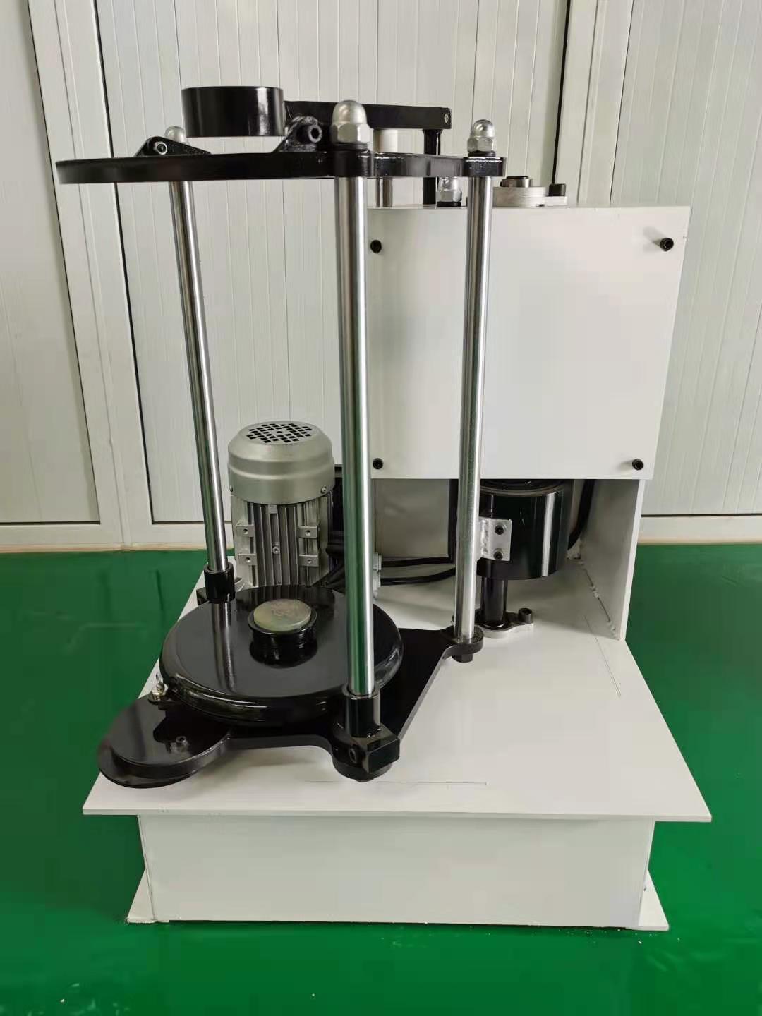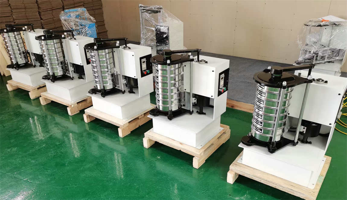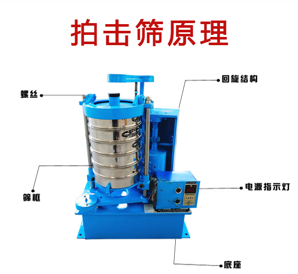 電機帶動齒輪通過同步帶傳動到主軸上,經齒輪變速后主軸按要求的轉速轉動,主軸帶動偏心輪使滑板做往復運動,帶動安裝在滑板托盤中的試驗篩左右搖動,同時主軸帶動頂桿齒輪轉動,變速后頂桿齒輪通過凸輪頂擊頂桿,頂桿使拍錘上下拍擊試驗篩上蓋,使得試驗篩、分樣篩中的物料往復和上下振動,使小于試驗篩的篩面網孔的物料顆粒篩分進下層試驗篩,如此層層篩選,使每層試驗篩內只留相同粒度的物料。達到不同粒度的分離并確定此物料的粒度組成。
