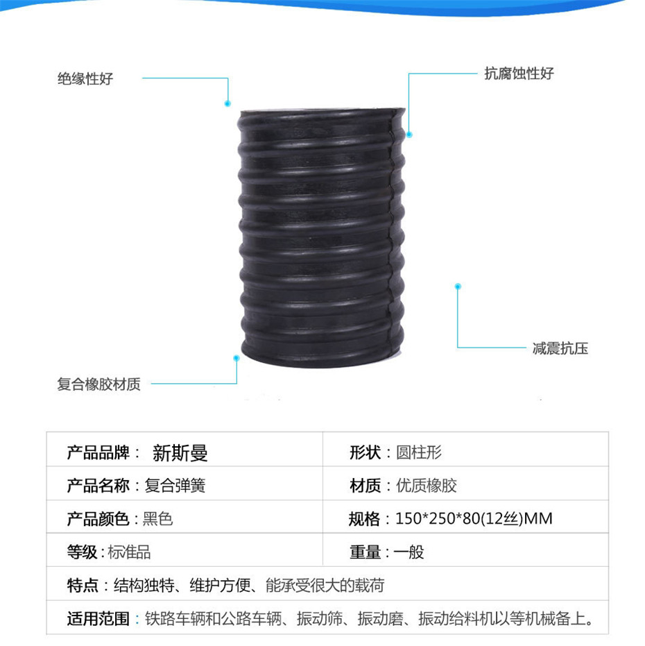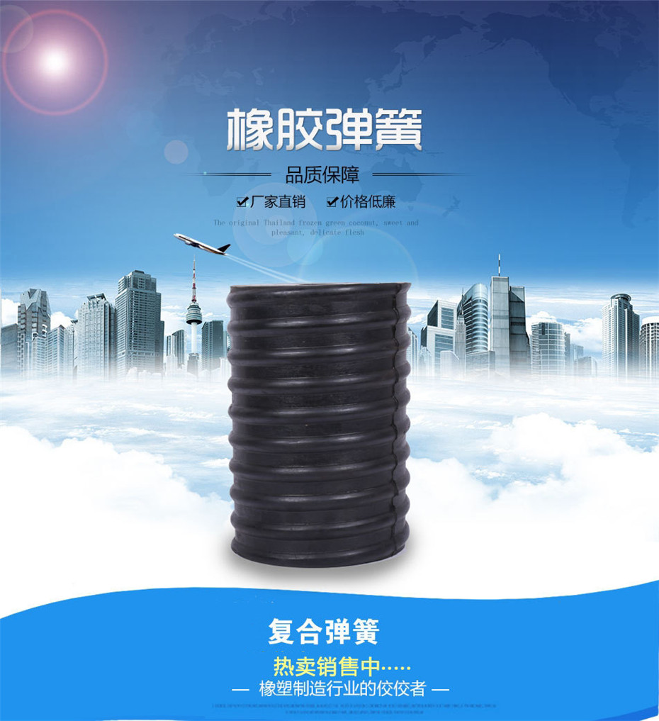 咨詢熱線:15537323577 復(fù)合彈簧:是由金屬螺旋彈簧和橡膠復(fù)合在一起的園筒狀彈性體。該產(chǎn)品優(yōu)于金屬?gòu)椈?,具有抗腐蝕性好、壽命長(zhǎng)等優(yōu)點(diǎn),與其它彈簧相比,減振能力強(qiáng),緩沖效果好。