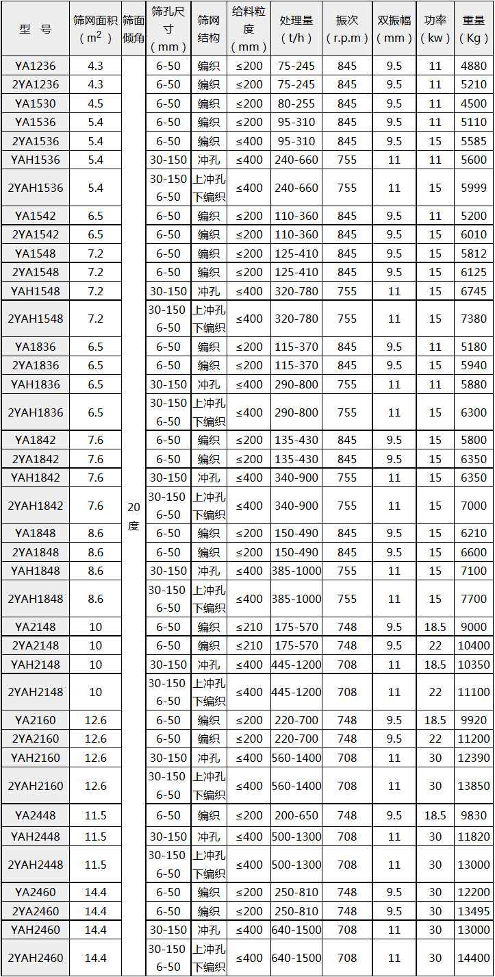 YA系列圓振動篩的主要技術(shù)參數(shù):