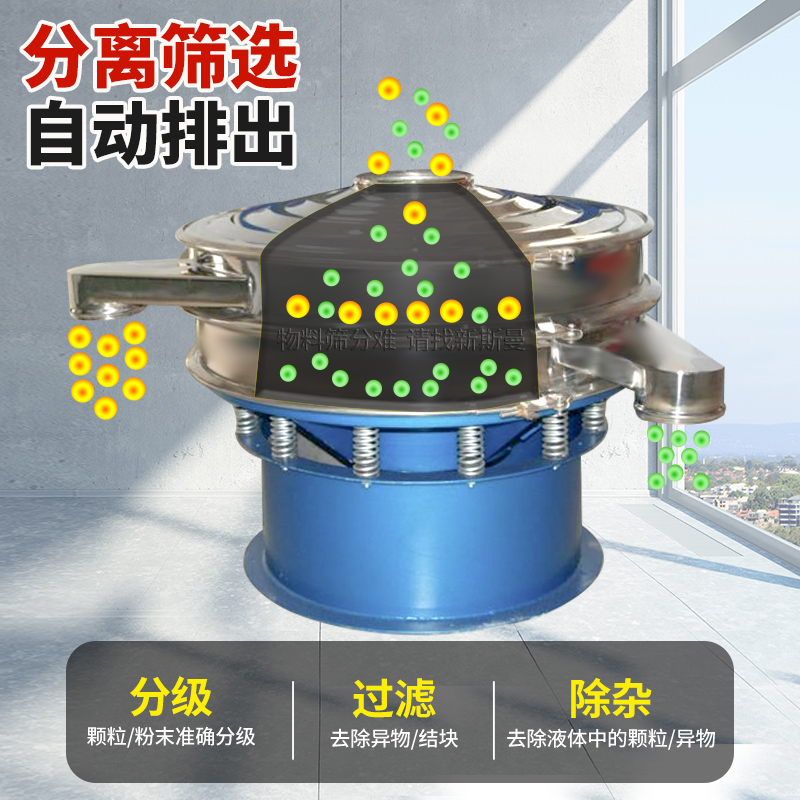 任何顆粒、粉末、粘液一定范圍內(nèi)均可篩選。篩分細(xì)至500目或0.028mm, 過濾小可至5微米。分級篩選,可篩一至五層篩網(wǎng),能同時進(jìn)行二至六個等級的分選或過濾。